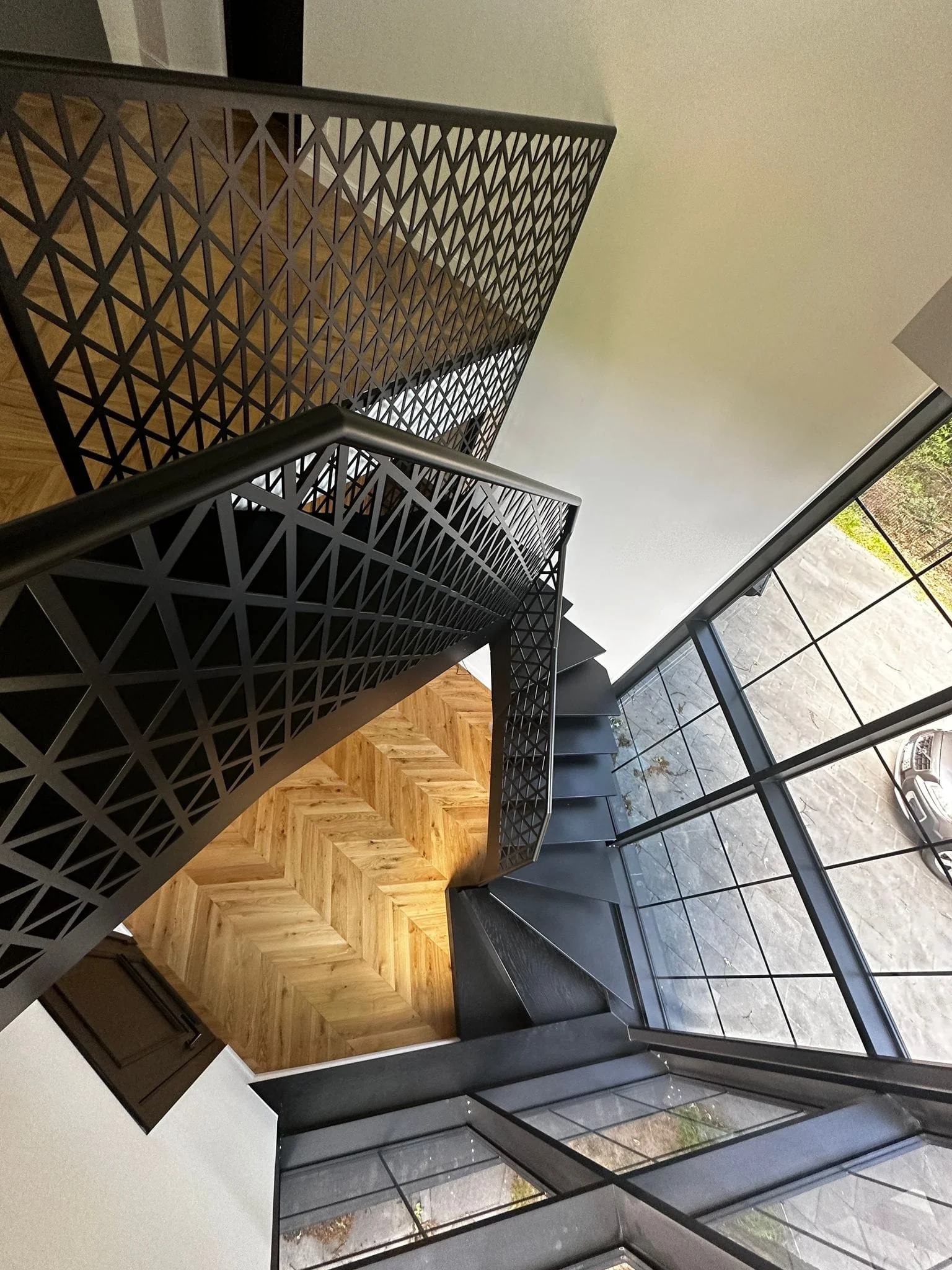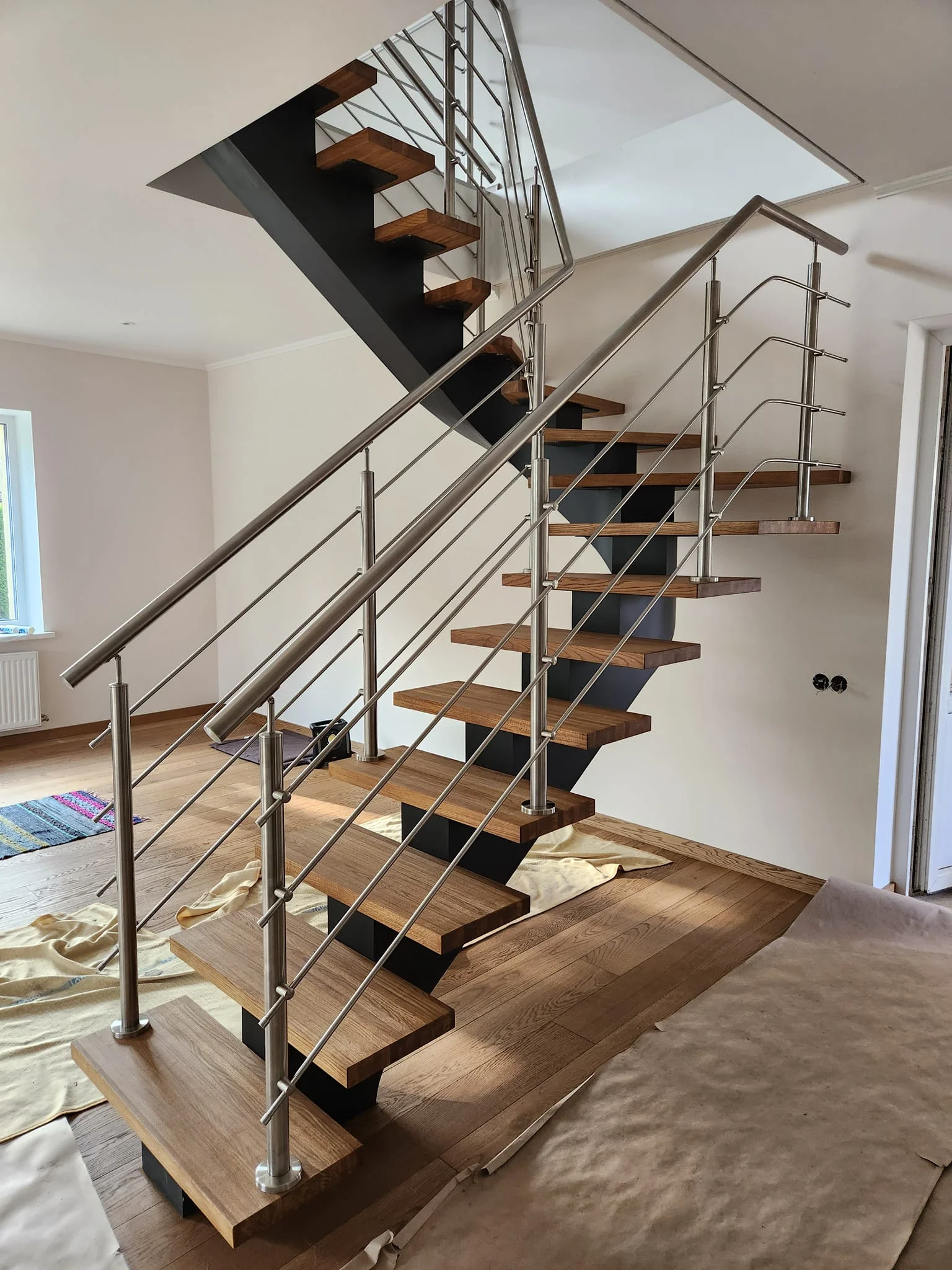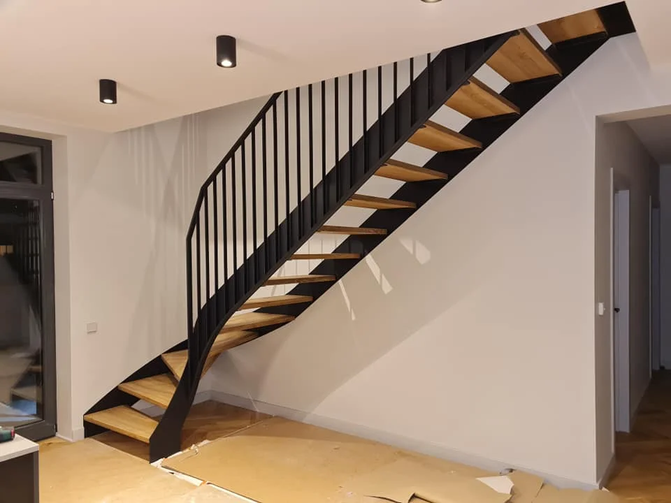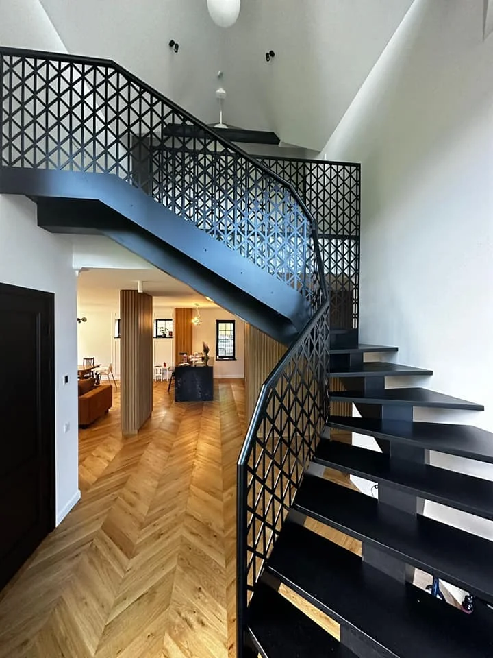 Pilna kāpņu komplekta izgatavošana. Tērauda rāmis ar melniem koka pakāpieniem. Margu dizainā izmantots lāzer griešanā izveidots režģis, kas ir arī kā norobežojums.