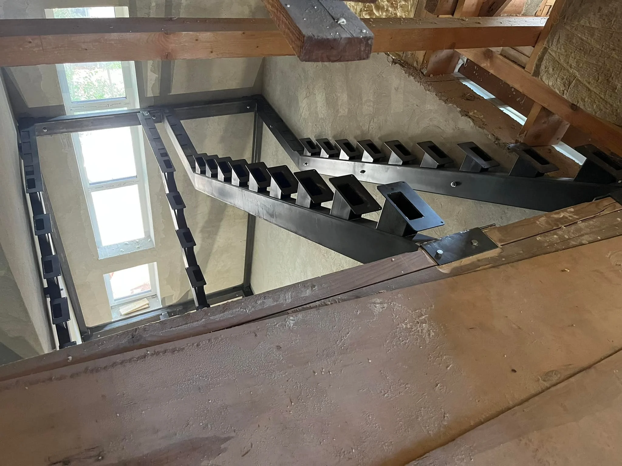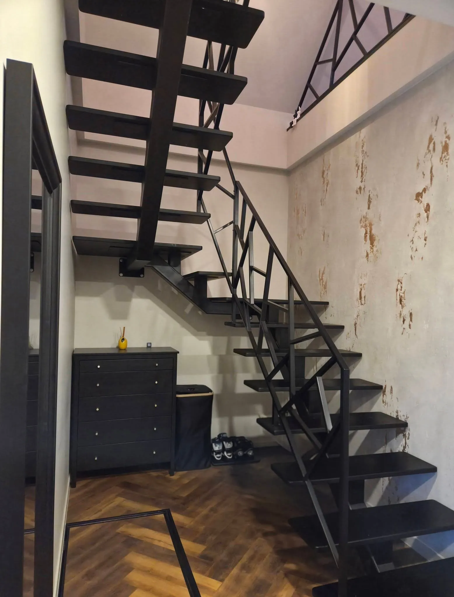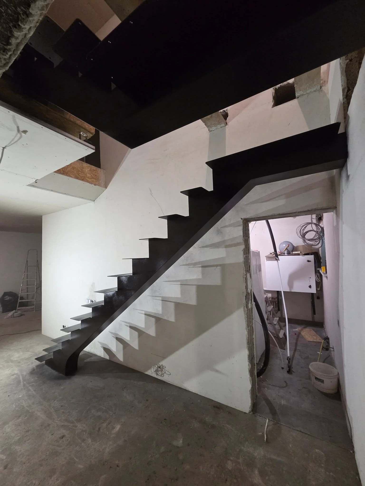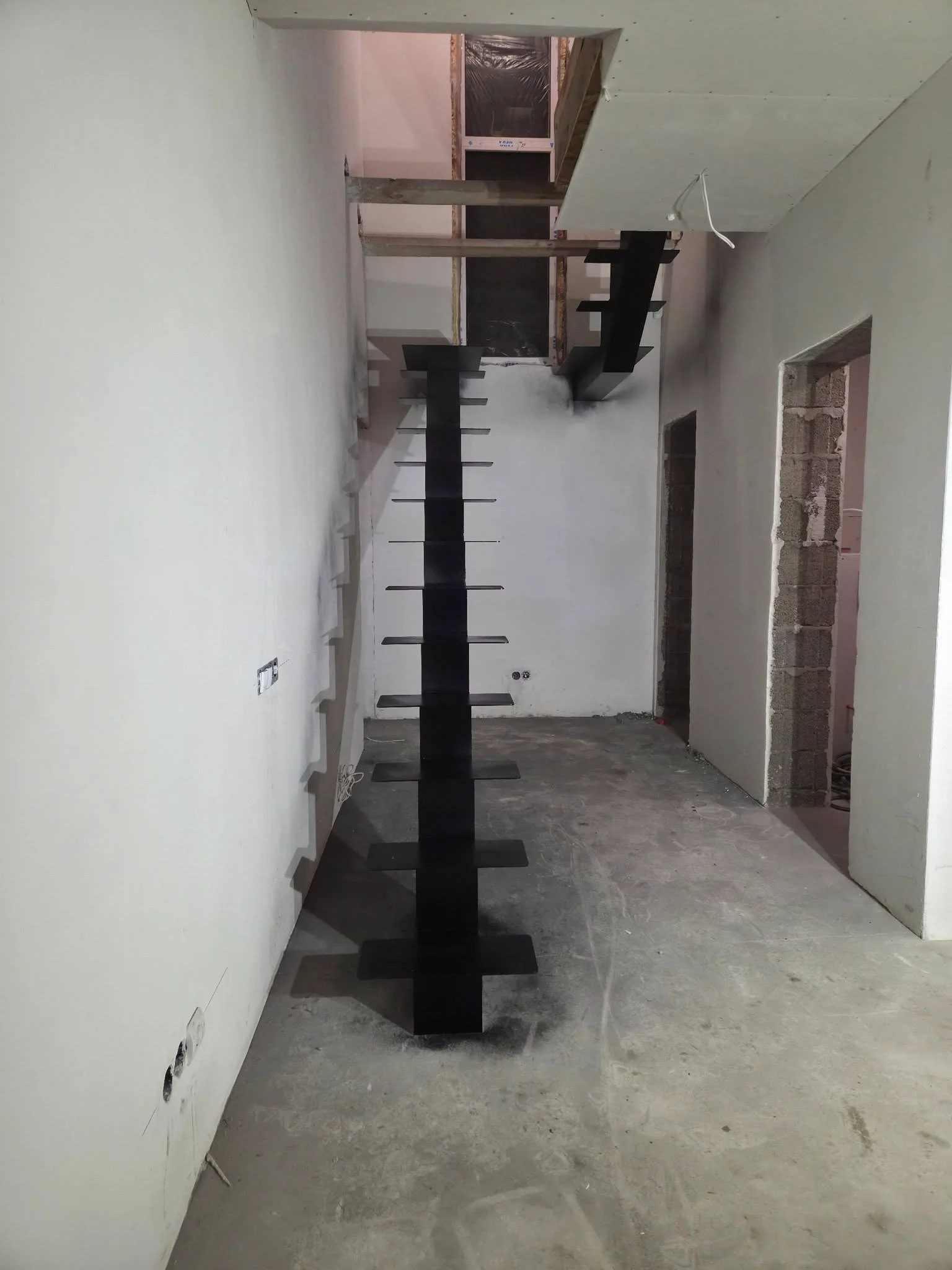 Divi taisni tērauda rāmji ar platformu, kas nokrāsota melnā krāsā. Klients pats liek visu pārējo vai pakāpienus un margas taisa vēlāk. Šajā objektā procesu atviegloja tas, ka vēl nebija pabeigtas sienas un grīda, līdz ar to nebija iespēja sabojāt svaigu krāsojumu vai parketu.