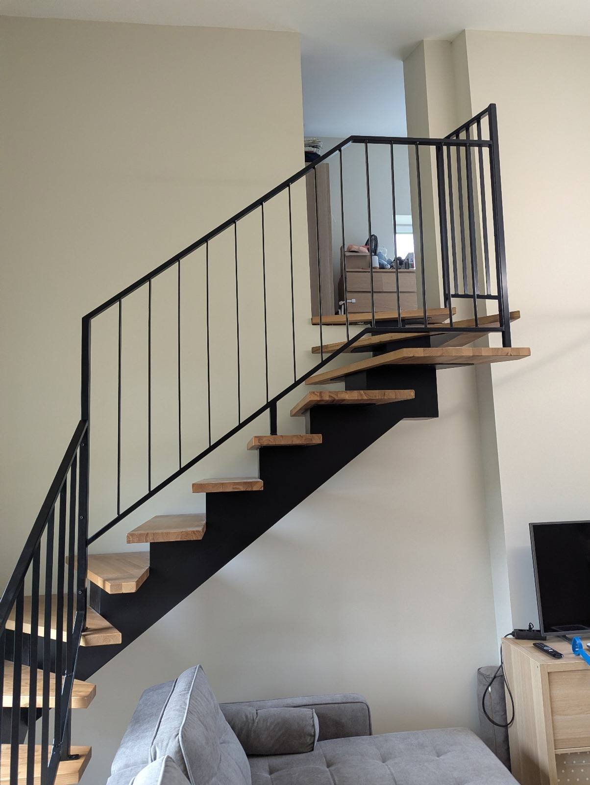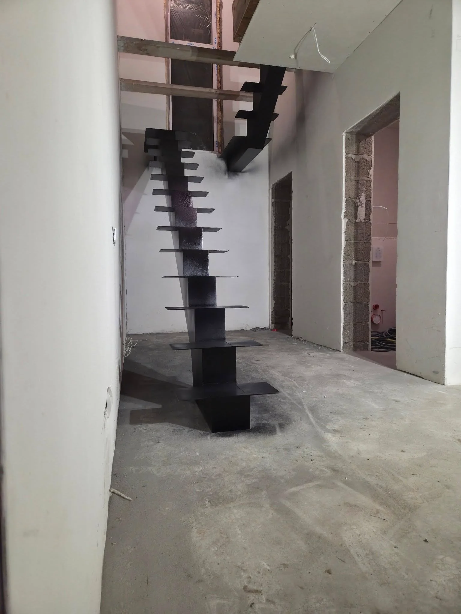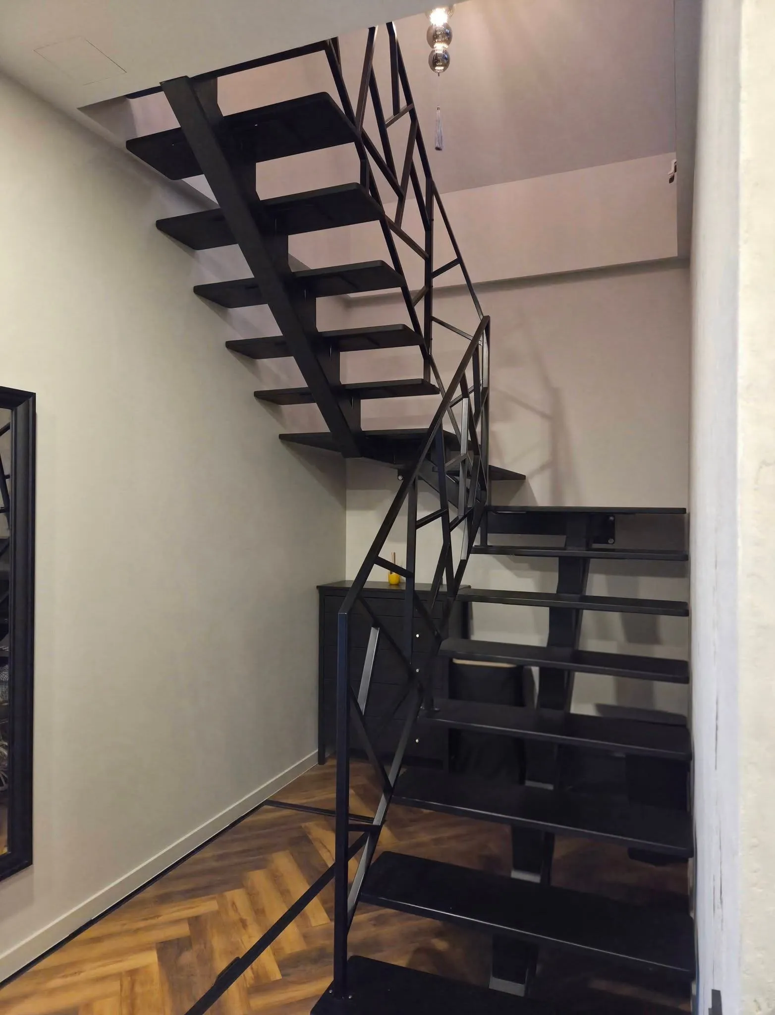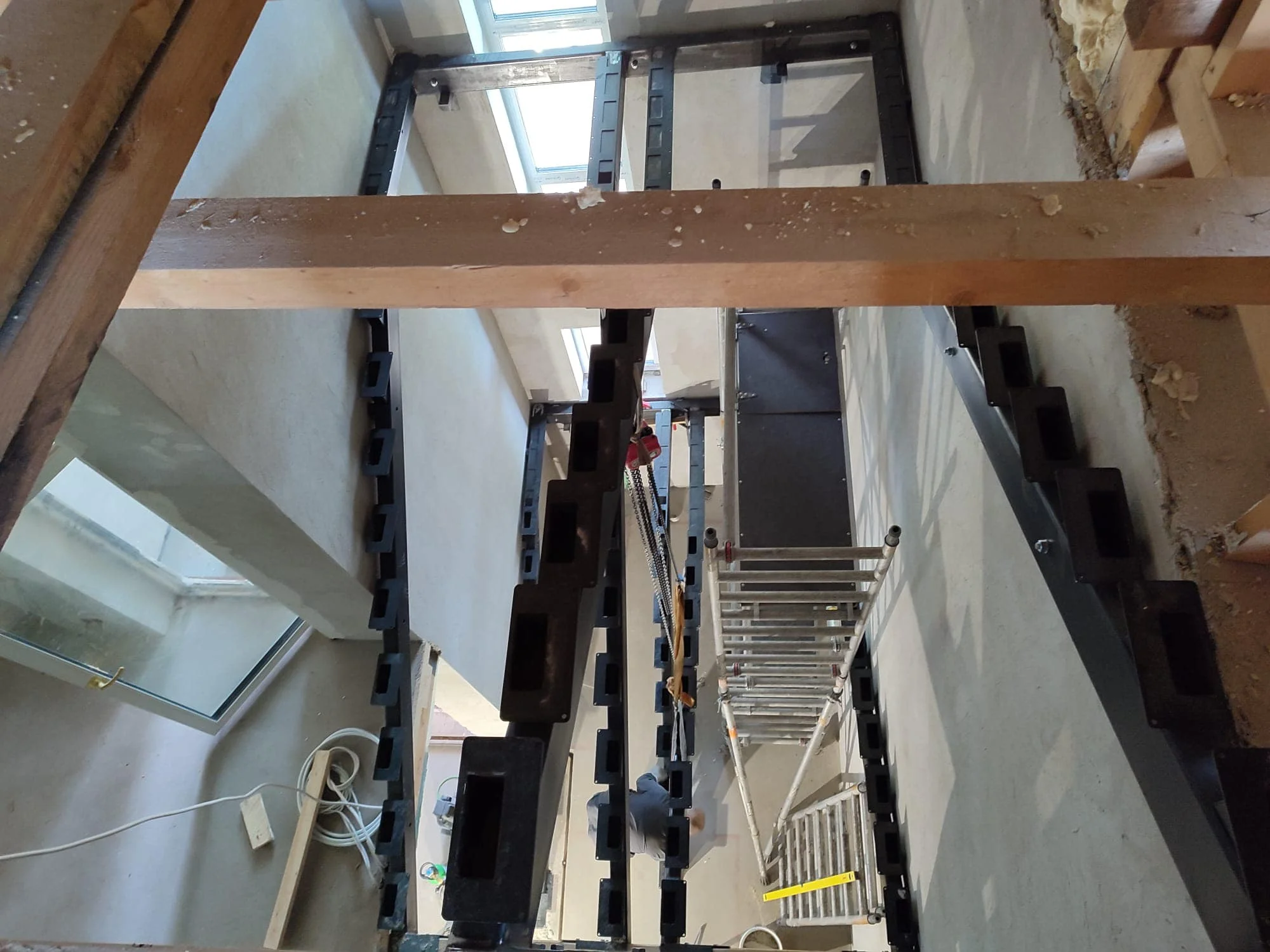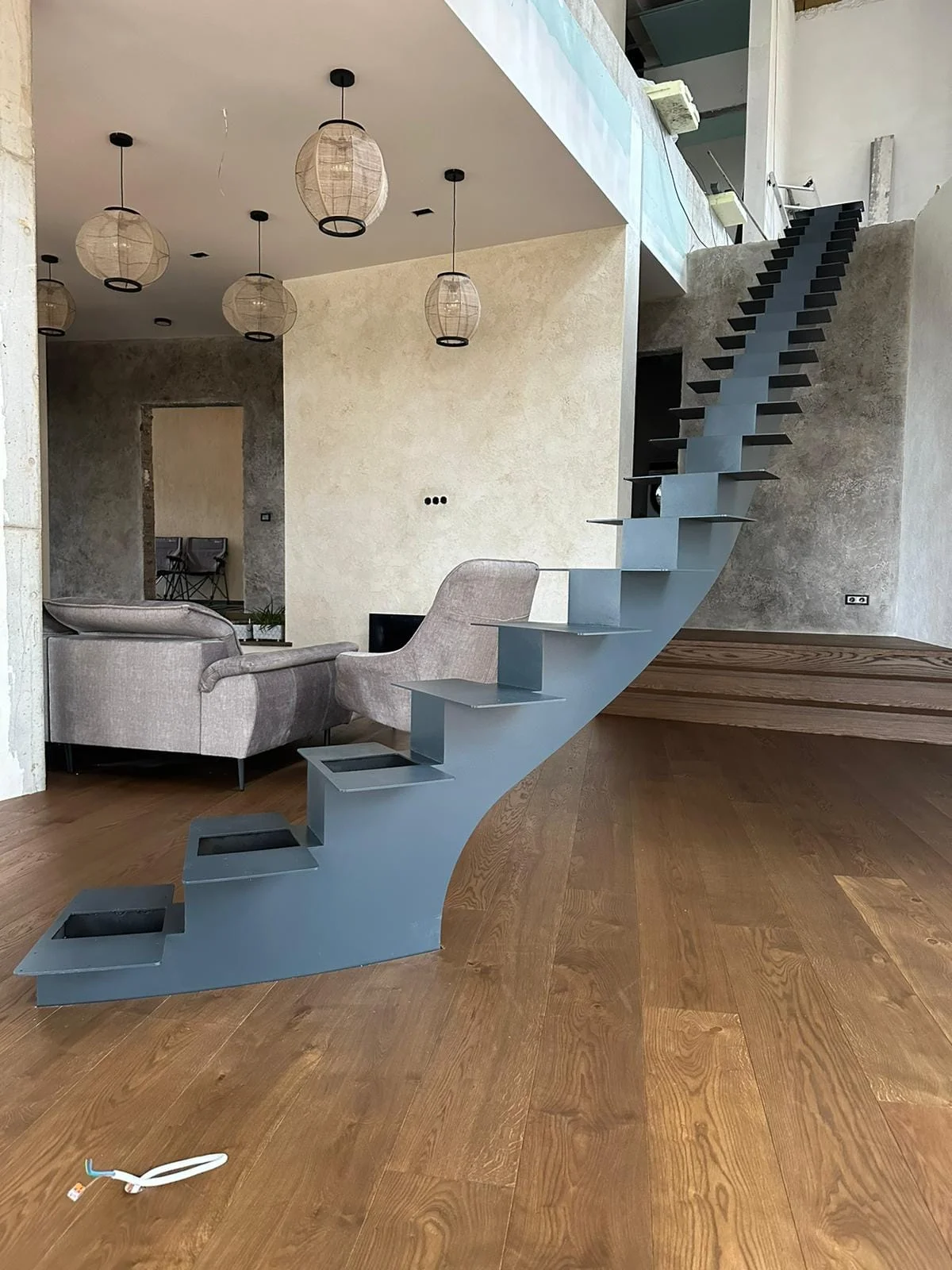Divi taisni tērauda rāmji ar platformu, kas nokrāsota melnā krāsā. Klients pats liek visu pārējo vai pakāpienus un margas taisa vēlāk. Šajā objektā procesu atviegloja tas, ka vēl nebija pabeigtas sienas un grīda, līdz ar to nebija iespēja sabojāt svaigu krāsojumu vai parketu.