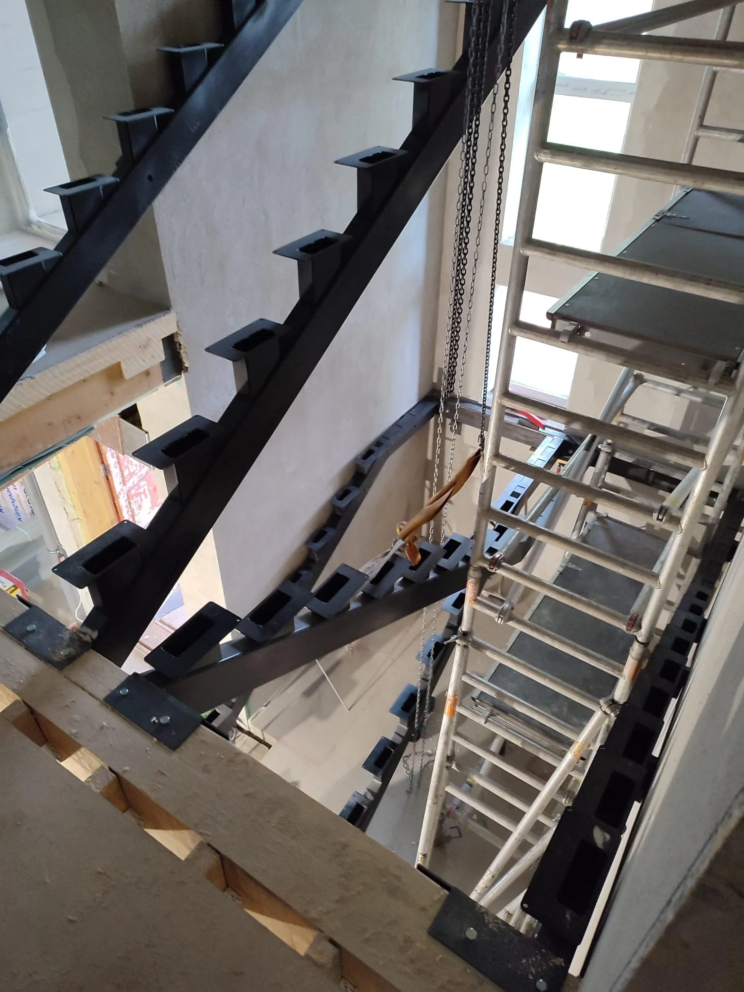 Klients vēlējās 3 stāvu mājai izveidot tērauda kāpņu rāmi ar platformām. Metāls netika apstrādāts un pakāpienus/platformas liek pats klients.