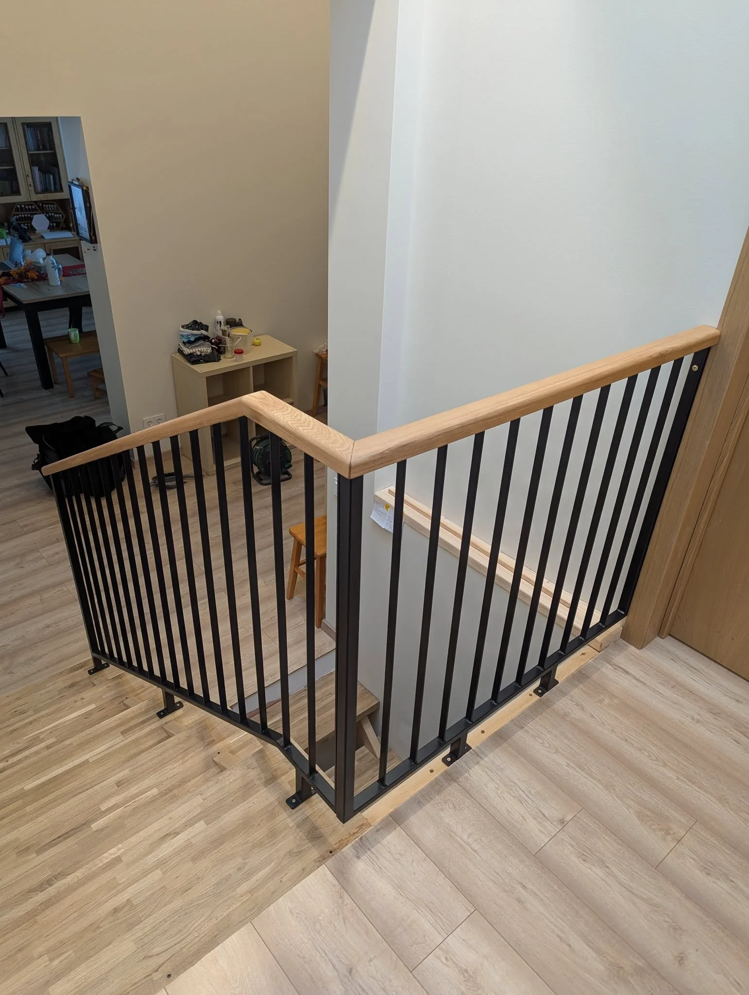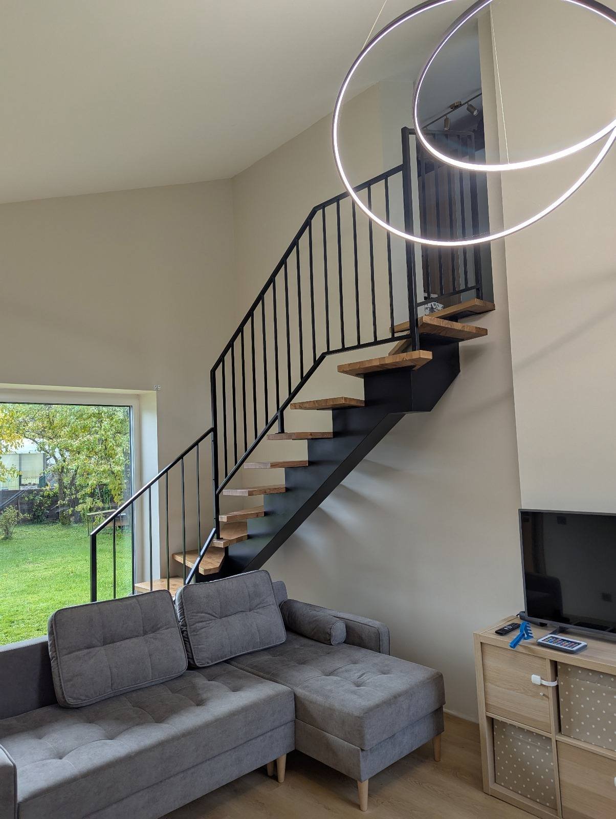 Šajā projektā klientam vajadzīgas bija tikai margas. Tika izgatavotas minimalistiskas tēraudas margas pulverkrāsotas RAL9011 - Melna grafīta krāsa. Ar koka rokturi 60x35 - patīkamāk pieskarties ar rokām. Augšā bija jāuzmanās neieurbt siltajās grīdās.