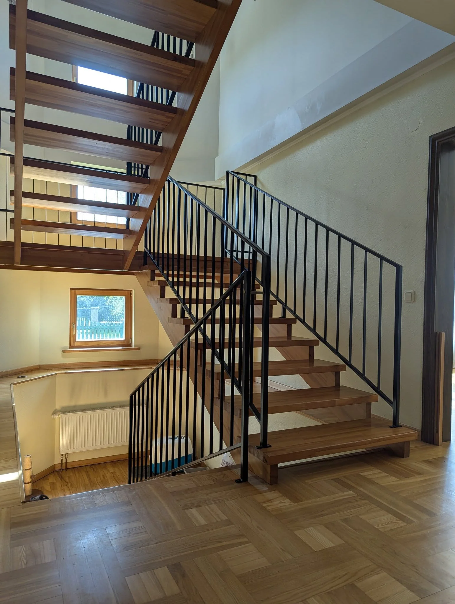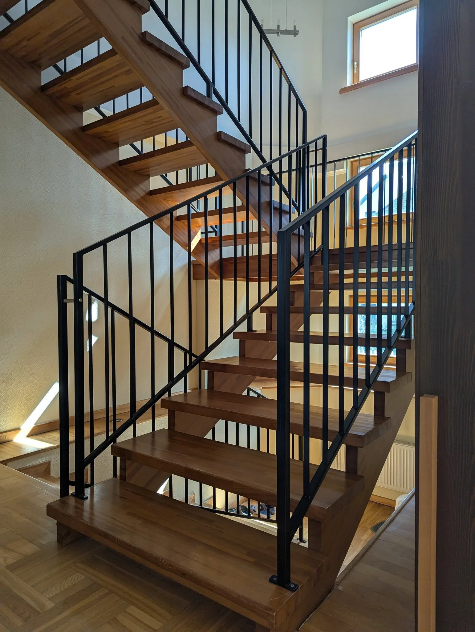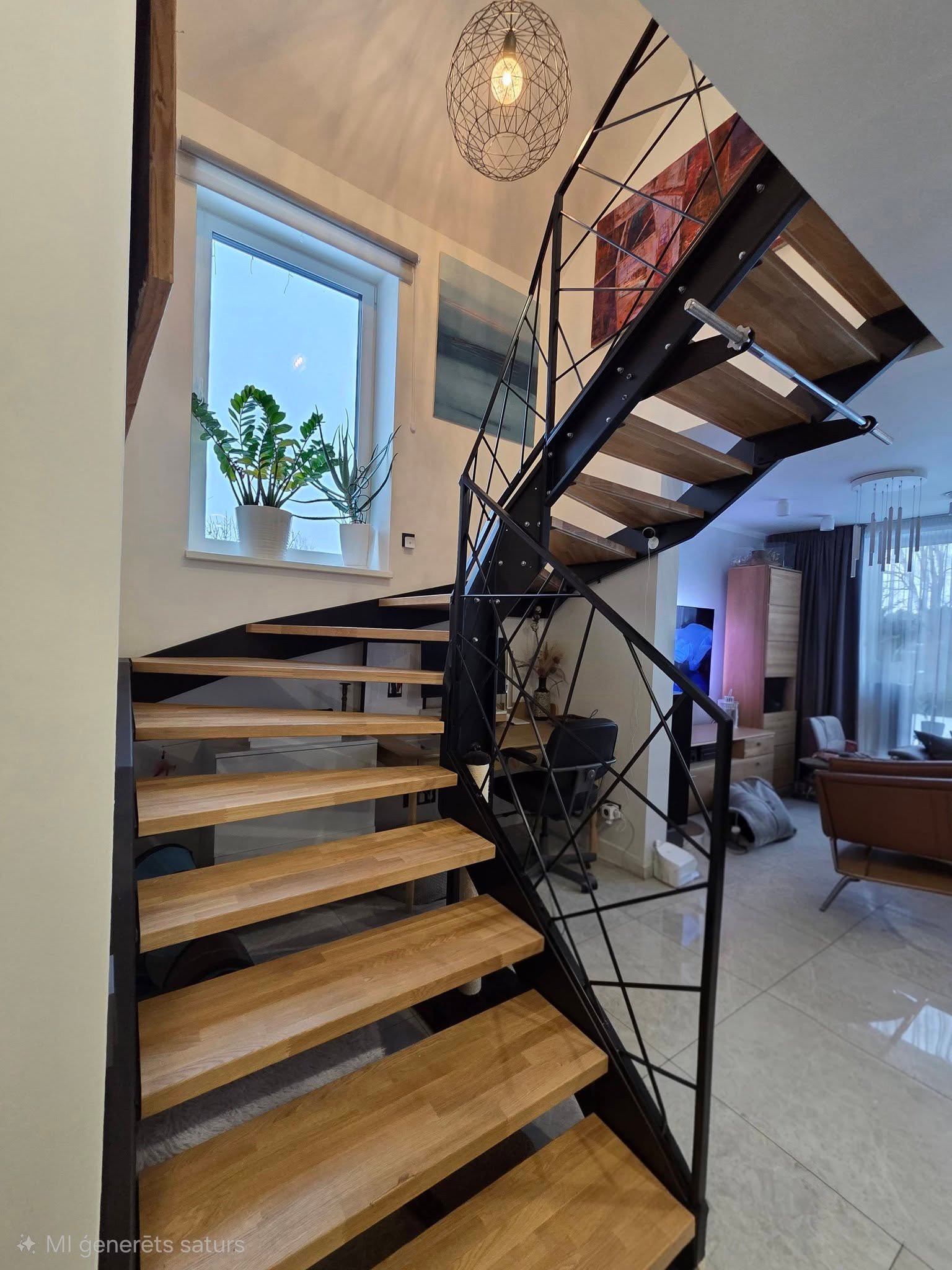Ļoti labi uztaisītas melnas trepes ar margām un ko ka pakāpieniem.